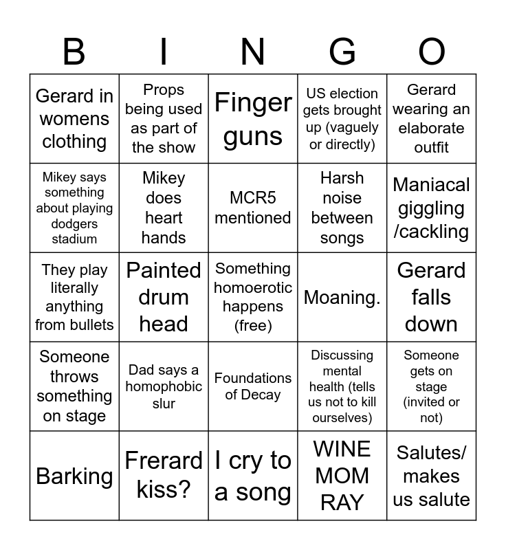 This bingo card has a free space and 24 words: Dad says a homophobic slur, Frerard kiss?, MCR5 mentioned, Barking, Gerard wearing an elaborate outfit, Gerard in womens clothing, Mikey says something about playing dodgers stadium, Props being used as part of the show, Moaning., Foundations of Decay, Harsh noise between songs, They play literally anything from bullets, Discussing mental health (tells us not to kill ourselves), Someone gets on stage (invited or not), Mikey does heart hands, WINE MOM RAY, Gerard falls down, Finger guns, Maniacal giggling /cackling, Painted drum head, Salutes/ makes us salute, Someone throws something on stage, US election gets brought up (vaguely or directly) and I cry to a song.