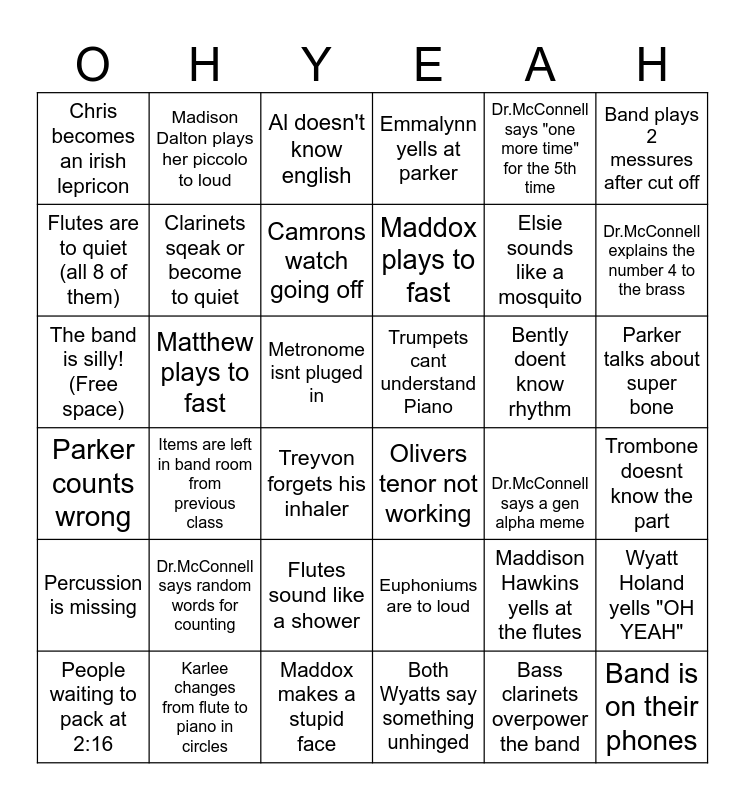 This bingo card has 36 words: Euphoniums are to loud, Flutes sound like a shower, Both Wyatts say something unhinged, Flutes are to quiet (all 8 of them), Parker counts wrong, Trumpets cant understand Piano, Clarinets sqeak or become to quiet, Maddox makes a stupid face, Dr.McConnell says "one more time" for the 5th time, Maddison Hawkins yells at the flutes, Dr.McConnell explains the number 4 to the brass, Emmalynn yells at parker, Wyatt Holand yells "OH YEAH", Matthew plays to fast, Maddox plays to fast, Chris becomes an irish lepricon, Percussion is missing, Bently doent know rhythm, The band is silly! (Free space), Al doesn't know english, Metronome isnt pluged in, Items are left in band room from previous class, Olivers tenor not working, Treyvon forgets his inhaler, Dr.McConnell says a gen alpha meme, Madison Dalton plays her piccolo to loud, Elsie sounds like a mosquito, Karlee changes from flute to piano in circles, Camrons watch going off, Band plays 2 messures after cut off, Band is on their phones, People waiting to pack at 2:16, Trombone doesnt know the part, Parker talks about super bone, Dr.McConnell says random words for counting and Bass clarinets overpower the band.