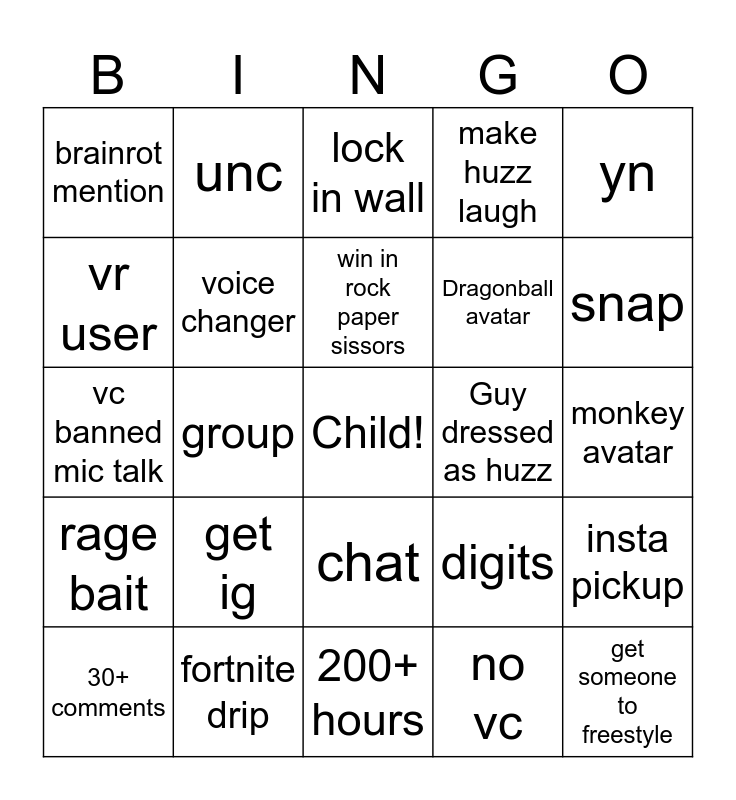 This bingo card has a free space and 24 words: get ig, fortnite drip, win in rock paper sissors, 30+ comments, yn, brainrot mention, vr user, unc, Guy dressed as huzz, chat, Dragonball avatar, vc banned mic talk, digits, insta pickup, voice changer, no vc, monkey avatar, lock in wall, snap, group, get someone to freestyle, rage bait, make huzz laugh and 200+ hours.