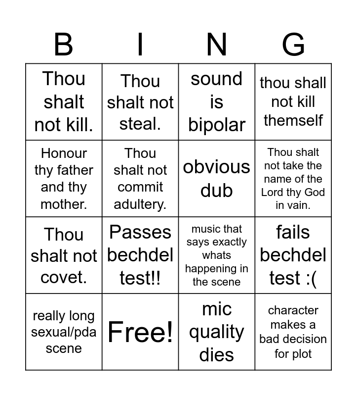 This bingo card has 25 words: Thou shalt have no other gods before me., Thou shalt not make unto thee any graven image., Thou shalt not take the name of the Lord thy God in vain., Remember the sabbath day, to keep it holy., Honour thy father and thy mother., Thou shalt not kill., Thou shalt not commit adultery., Thou shalt not steal., Free!, Thou shalt not bear false witness against thy neighbor., Thou shalt not covet., music that says exactly whats happening in the scene, edgy monologue, homoerotic tension, obvious dub, shitty effects, mic quality dies, sound is bipolar, Passes bechdel test!!, fails bechdel test :(, really long sexual/pda scene, m(b)oobs, character makes a bad decision for plot, thou shall not kill themself and really bad outfit.