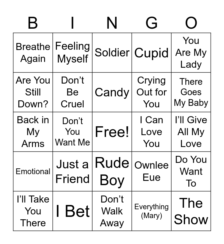 This bingo card has a free space and 299 words: 1 Thing, Always Be My Baby, Are You Still Down?, Baby (Ashanti), Baby Baby Baby, Baby Boy, Bad Girl (Usher), Bag Lady, Before I Let You Go (Beyonce), Before You Walk Out, Be Happy, Best of Me (Jada), Blame It, Break My Soul, Buddy, Buy U A Drink, Candy Rain, Can’t You See, Can We Talk, Come and Talk to Me, Creep, Crying Out for You, Diamonds, Diary, Diva, Don’t Forget About Us, Don’t Take It Personal, Don’t Walk Away, Doo Wop, Drogba, Drunk in Love, Essence, Everything (Mary), Fallin, Flawless remix, Get Busy, Get Me Bodied, Girls Dem Sugar, Go Crazy (Chris), Good Energy, Grapevyne, Hey Daddy, How Does It Feel?, How Do I Breathe, How Many Drinks?, How We Roll, I Can Love You, If I Ain’t Got You, If I Was Your Man, If You Love Me (Brown), I’ll Be Around, I Love Your Smile, I’m Ready, I’m So into You, I’ve Changed, I Wanna Be Down, Jerusalema, Just a Friend, Just Fine, Let Me Love You, Level Up, Love No Limit, Lovers and Friends, Made For Me, Make Her Feel Good, Murder She Wrote, My Life (Mary), Never Leave You, No Air, No Letting Go, No Love (August), No One Else, No Scrubs, The One (Tamar), Oops, Pressure, Real Love (Mary), Reminisce, Right Here, Rock the Boat, Rude Boy, Shining, Slow Down, So, Fly, Soldier, Sorry (Bey), Summer Rain, Sweet Thing, Tell Me (Dru), That’s the Way Love Goes, There Goes My Baby, This Is How We Do It, Too Close, Trip (Ella), Twisted, Tyrone, When I See U, (When You Gonna), Wifey, Work, Yernin, You Don’t Know My Name, You Make Me Wanna, You Remind Me, 4AM, 4 Page Letter, 5 Steps, Again (Janet), All My Life, Angel of Mine, Back in My Arms, Bed (J), Body Party, Boo’d Up, Breathe Again, Butta Love, Can’t Get Enough, Can You Stand the Rain?, Cater 2 U, The Closer I Get to You (R), Cupid, Cursed, Do You Want To, Emotional, Fortunate, Good Good, Heaven Sent, He’s Mine, I Bet, I Gotta Be, I Like (Kut), I’ll Give All My Love, I’ll Make Love to You, I love Me Some Him, I Love You (Faith), I’m Going Down, I’m Still in Love with You (NE), Let Me Know, Love (Musiq), Nice & Slow, Nobody, Nobody’s Supposed to be Here, No One, No Ordinary Love, Please Don’t Go, Practice What You Preach, Pretty Wings, Promise (Ciara), Red Light Special, Refill, Someone to Love, Tender Kisses, They Don’t Know, This Woman’s Work, Trust, Understanding, Weak, We Belong Together, Where Do We Go from Here?, Who Can I Run To?, Why I Love You So Much, You Gotta Believe, ll Eyes on You (Meek), All I Do Is Win, Always on Time, Another Round, Aston Martin, Between Me and You, Bodak Yellow, Bust It Baby, Conceited (Remy), Cut It, Dilemma, Doin It, Do You Mind, Dreams and Nightmares, Every day We Lit, Feeling Myself, Flap Your Wings, Get Money, Go DJ, Gotta Man, How Do You Want It?, If I Ruled the World, I Get Money, I’m A Boss, In My Feelings, Juicy, Keep Ya Head Up, Lean Back, Lifestyle, Live Your Life, Lollipop, Mrs. Officer, My Dawg, On Chill, One More Chance, Preach, Put On, RockStar, Run This Town, Started from The Bottom, Swag Surfin, Tha Crossroads, Toosie Slide, Touch It, Track Star, Up, Wait, Way Too Gone, We Fly High, Whatever You Like, You the Boss, Ain’t Nobody (Chaka), Ain’t No Stopping Us Now, All Around the World, All I Do Is Think of You, Always and Forever, Around the Way, As We Lay, Back to Life, Best of My Love, Body and Soul, Candy, Don’t Be Cruel, Don’t Stop Til You Get, Don’t You Want Me, Encore, Escapade, Expression, Fire and Desire, Follow Me, Giving Him Something, Glamorous Life, Head to Toe, Here and Now, Here Come, Hold On, I Apologize, I Can’t Wait Another Minute, If I Ever Fall in Love, If It Isn’t Love, If Only You Knew, If You Asked Me To, If You Think You’re Lonely, I Got It Made, I Like the Way, I’ll Take Your Man, I’ll Take You There, I Need Love, It Takes Two, I Want to Thankyou, I Wonder If I Take You Home, Kiss, Let Me Clear My Throat, Let’s Get It On, Let the Music Play, Love Come Down, Love Don’t Love Nobody, Love, Need and Want You, Make It Last Forever, My Lovin, Never Too Much, Off on Your Own, The Overweight Lover, Ownlee Eue, Poison, Push It (Salt), Reasons, Return of The Mack, Rock Me Tonight, Rock Steady, Rock the Bells, Secret Lovers, September, Shoop, The Show, Show Me Love, Silly, Something in My Heart, Square Biz, Summertime Summertime, Superwoman, Tender Love, Whatta Man, When I Think of You, You Are My Lady, Your Secret Love, All I Want for Christmas, Give love on Christmas Day, Have Yourself a Merry, Last Christmas, Let It Snow, Santa Claus is Coming, Santa Tell Me, Silent Night, Sleigh Ride, This Christmas and What Christmas Means.