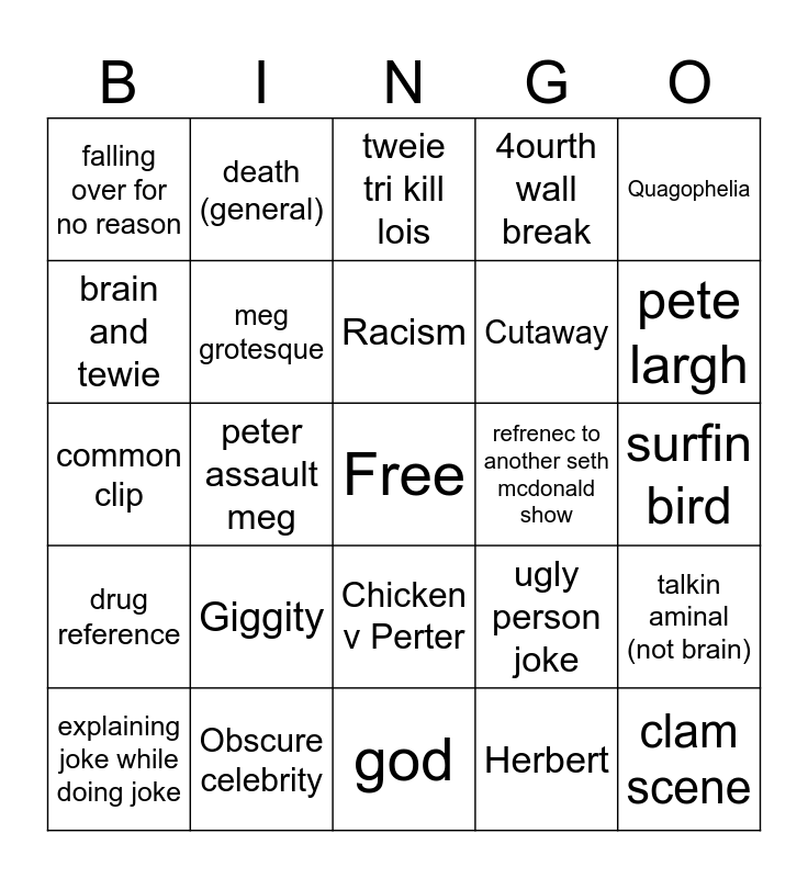This bingo card has a free space and 24 words: Giggity, Obscure celebrity, Racism, explaining joke while doing joke, Quagophelia, falling over for no reason, brain and tewie, death (general), refrenec to another seth mcdonald show, Chicken v Perter, Cutaway, common clip, ugly person joke, talkin aminal (not brain), meg grotesque, Herbert, surfin bird, tweie tri kill lois, pete largh, peter assault meg, clam scene, drug reference, 4ourth wall break and god.