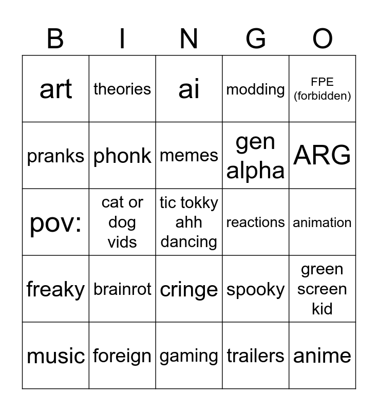 This bingo card has 25 words: brainrot, gaming, memes, music, FPE (forbidden), art, pranks, theories, reactions, cringe, gen alpha, pov:, spooky, green screen kid, phonk, anime, animation, ai, ARG, cat or dog vids, tic tokky ahh dancing, foreign, freaky, modding and trailers.