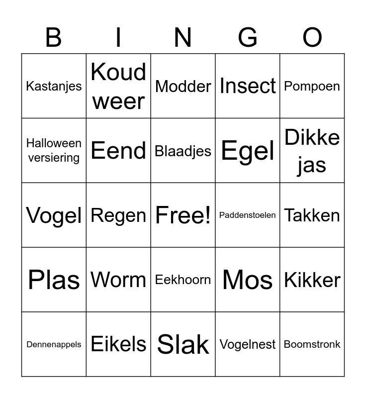 This bingo card has a free space and 24 words: Worm, Eikels, Blaadjes, Dennenappels, Pompoen, Kastanjes, Halloween versiering, Koud weer, Paddenstoelen, Eekhoorn, Egel, Vogel, Mos, Kikker, Eend, Vogelnest, Takken, Modder, Dikke jas, Regen, Boomstronk, Plas, Insect and Slak.