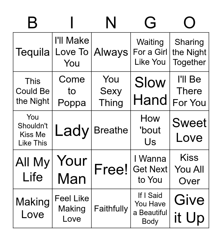 This bingo card has 26 words: Free!, If I Said You Have a Beautiful Body, You Sexy Thing, Feel Like Making Love, Sharing the Night Together, Tequila, This Could Be the Night, I'll Make Love To You, Sweet Love, I Wanna Get Next to You, Slow Hand, You Shouldn't Kiss Me Like This, Kiss You All Over, Making Love, Lady, A Little Bit More, Waiting For a Girl Like You, All My Life, Always, Breathe, I'll Be There For You, Faithfully, How 'bout Us, Your Man, Come to Poppa and Give it Up.