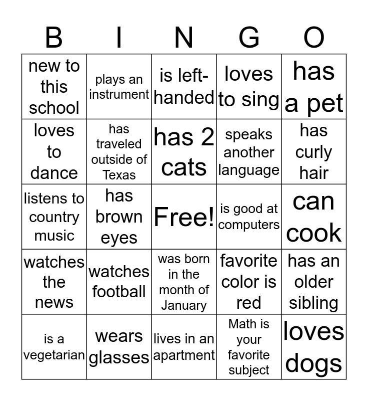 This bingo card has a free space and 24 words: watches football, wears glasses, has 2 cats, is a vegetarian, has a pet, new to this school, loves to dance, plays an instrument, is good at computers, was born in the month of January, speaks another language, listens to country music, favorite color is red, has an older sibling, has traveled outside of Texas, Math is your favorite subject, can cook, is left-handed, has curly hair, has brown eyes, loves dogs, watches the news, loves to sing and lives in an apartment.