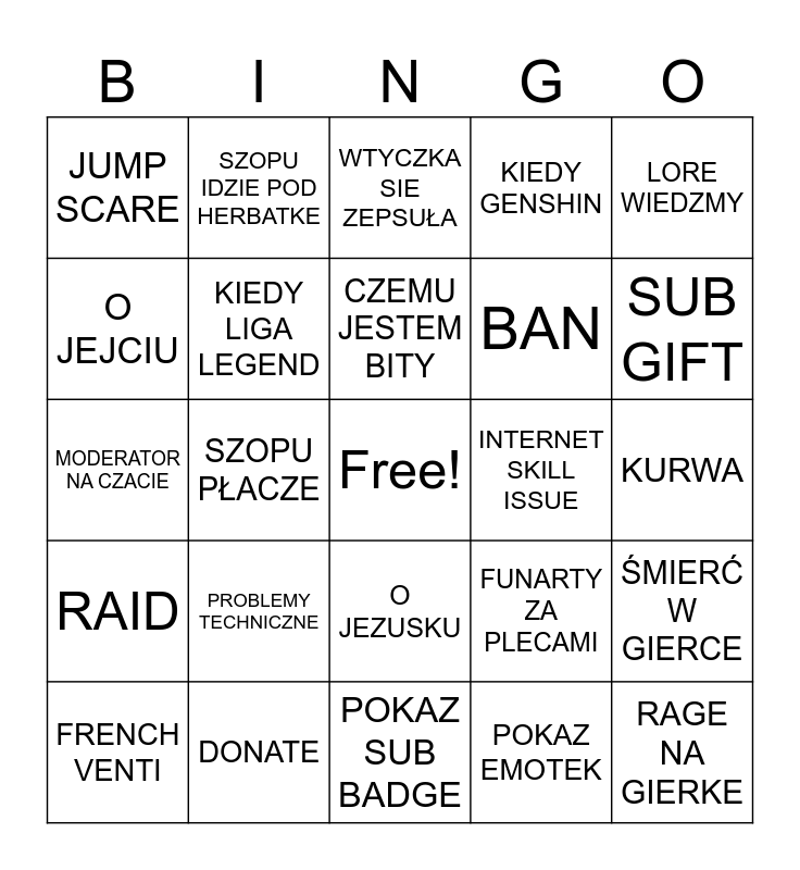 This bingo card has a free space and 24 words: PROBLEMY TECHNICZNE, DONATE, CZEMU JESTEM BITY, FRENCH VENTI, LORE WIEDZMY, JUMP SCARE, O JEJCIU, SZOPU IDZIE POD HERBATKE, INTERNET SKILL ISSUE, O JEZUSKU, BAN, MODERATOR NA CZACIE, FUNARTY ZA PLECAMI, ŚMIERĆ W GIERCE, KIEDY LIGA LEGEND, POKAZ EMOTEK, KURWA, WTYCZKA SIE ZEPSUŁA, SUB GIFT, SZOPU PŁACZE, RAGE NA GIERKE, RAID, KIEDY GENSHIN and POKAZ SUB BADGE.