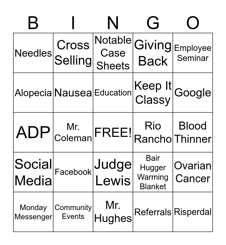 This bingo card has a free space and 24 words: Facebook, Community Events, Education, Monday Messenger, Employee Seminar, Needles, Alopecia, Cross Selling, Rio Rancho, Judge Lewis, Keep It Classy, ADP, Bair Hugger Warming Blanket, Ovarian Cancer, Nausea, Referrals, Blood Thinner, Notable Case Sheets, Google, Mr. Coleman, Risperdal, Social Media, Giving Back and Mr. Hughes.