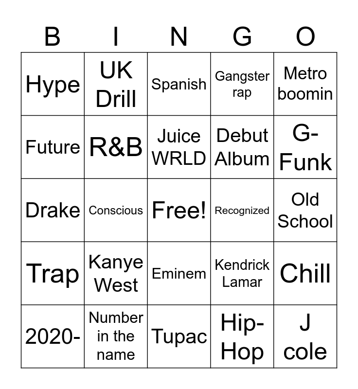 This bingo card has a free space and 24 words: Kanye West, Number in the name, Juice WRLD, 2020-, Metro boomin, Hype, Future, UK Drill, Recognized, Eminem, Debut Album, Drake, Kendrick Lamar, Chill, R&B, Hip-Hop, Old School, Spanish, G-Funk, Conscious, J cole, Trap, Gangster rap and Tupac.