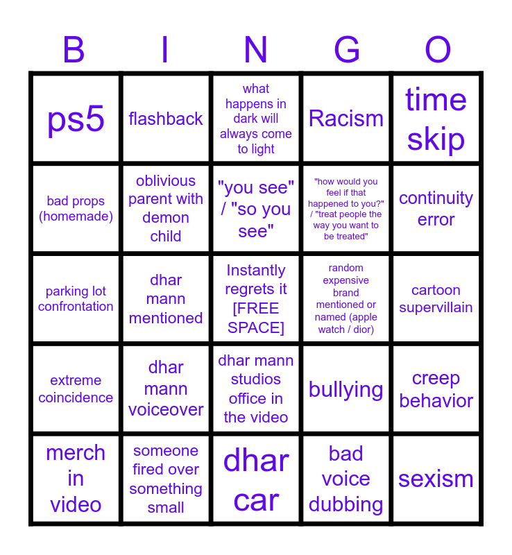 This bingo card has a free space and 25 words: dhar mann voiceover, dhar car, "you see" / "so you see", merch in video, time skip, ps5, bad props (homemade), flashback, random expensive brand mentioned or named (apple watch / dior), dhar mann studios office in the video, "how would you feel if that happened to you?" / "treat people the way you want to be treated", parking lot confrontation, bullying, creep behavior, oblivious parent with demon child, kids with ipad, cartoon supervillain, what happens in dark will always come to light, continuity error, dhar mann mentioned, sexism, someone fired over something small, extreme coincidence, Racism and bad voice dubbing.