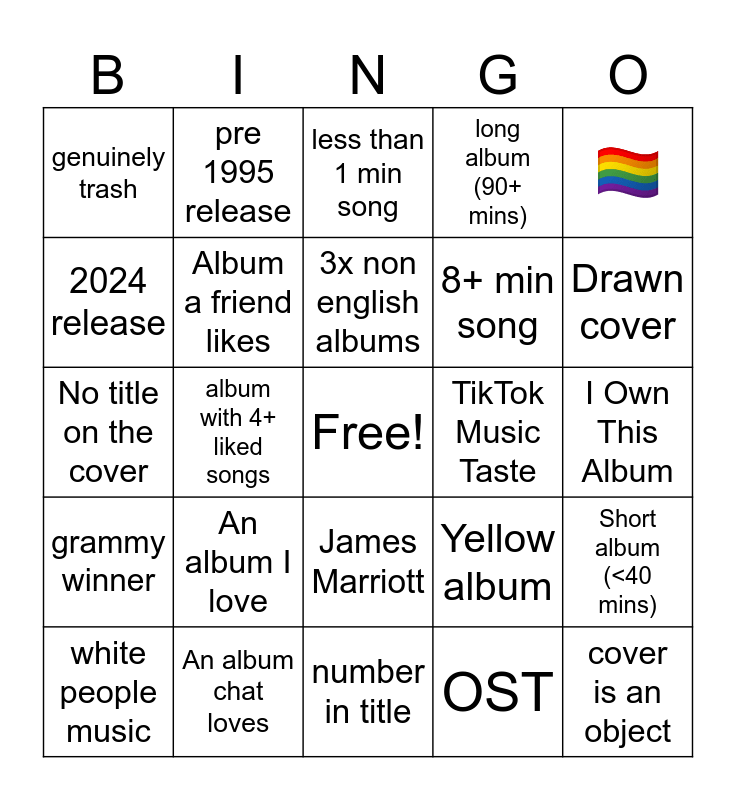 This bingo card has a free space and 24 words: An album I love, An album chat loves, 3x non english albums, white people music, 🏳️🌈, genuinely trash, 2024 release, pre 1995 release, TikTok Music Taste, James Marriott, 8+ min song, No title on the cover, Yellow album, Short album (<40 mins), Album a friend likes, OST, I Own This Album, less than 1 min song, Drawn cover, album with 4+ liked songs, cover is an object, grammy winner, long album (90+ mins) and number in title.