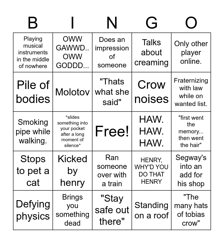 This bingo card has a free space and 24 words: Kicked by henry, Brings you something dead, "Thats what she said", Defying physics, Only other player online., Playing musical instruments in the middle of nowhere, Pile of bodies, OWW GAWWD.. OWW GODDD..., HAW. HAW. HAW., Ran someone over with a train, Crow noises, Smoking pipe while walking., HENRY, WHY'D YOU DO THAT HENRY, Segway's into an add for his shop, Molotov, Standing on a roof, "first went the memory... then went the hair", Does an impression of someone, Fraternizing with law while on wanted list., *slides something into your pocket after a long moment of silence*, "The many hats of tobias crow", Stops to pet a cat, Talks about creaming and "Stay safe out there".