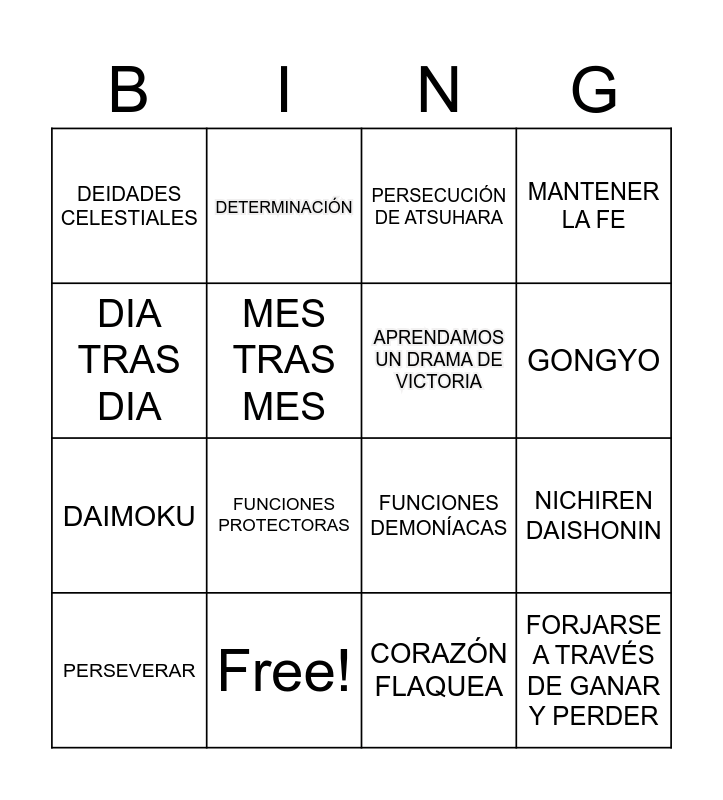 This bingo card has 16 words: Free!, NICHIREN DAISHONIN, PERSECUCIÓN DE ATSUHARA, DEIDADES CELESTIALES, DAIMOKU, DETERMINACIÓN, FUNCIONES DEMONÍACAS, CORAZÓN FLAQUEA, DIA TRAS DIA, MES TRAS MES, PERSEVERAR, MANTENER LA FE, FUNCIONES PROTECTORAS, GONGYO, APRENDAMOS UN DRAMA DE VICTORIA and FORJARSE A TRAVÉS DE GANAR Y PERDER.