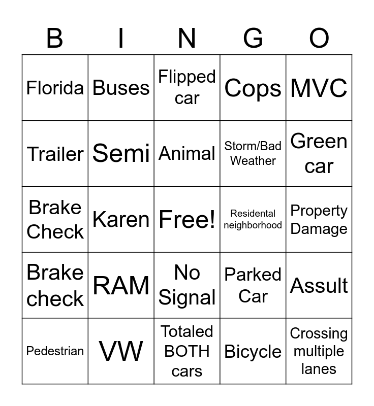 This bingo card has a free space and 24 words: RAM, VW, Animal, Pedestrian, MVC, Florida, Trailer, Buses, Residental neighborhood, No Signal, Storm/Bad Weather, Brake Check, Parked Car, Assult, Semi, Bicycle, Property Damage, Flipped car, Green car, Karen, Crossing multiple lanes, Brake check, Cops and Totaled BOTH cars.