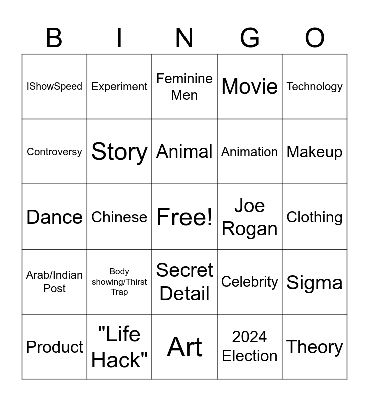 This bingo card has a free space and 24 words: Body showing/Thirst Trap, "Life Hack", Animal, Product, Technology, IShowSpeed, Controversy, Experiment, Joe Rogan, Secret Detail, Animation, Dance, Celebrity, Sigma, Story, 2024 Election, Clothing, Feminine Men, Makeup, Chinese, Theory, Arab/Indian Post, Movie and Art.