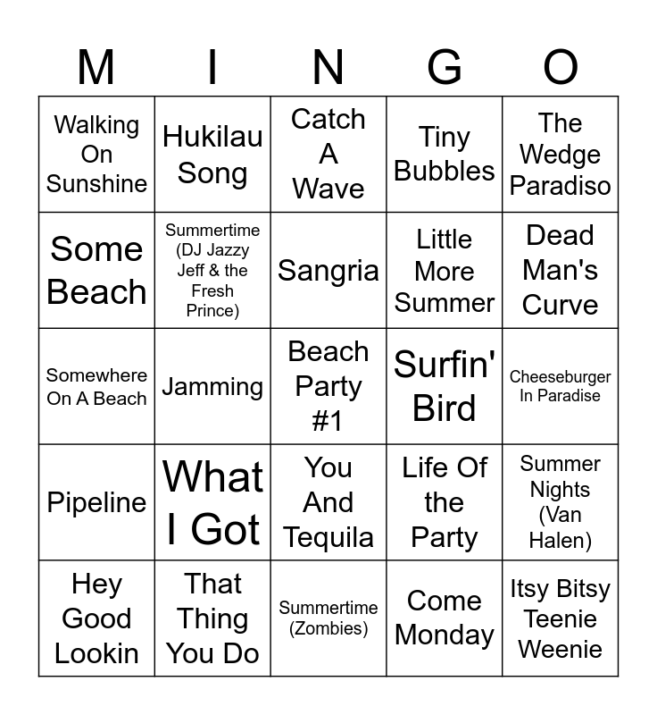 This bingo card has a free space and 75 words: Rock Lobster, Barbara Ann, Catch A Wave, Fun Fun Fun, God Only Knows, Good Vibrations, Help Me Rhonda, In My Room, Kokomo, Little Deuce Coupe, Sufrin' USA, Wouldn't It Be Nice, Sangria, Some Beach, Everything's Gonna Be Alright, Jamming, One Love, Itsy Bitsy Teenie Weenie, King Of the Surf Guitar, The Wedge Paradiso, Sand In My Shoes, Somewhere On A Beach, Summertime (DJ Jazzy Jeff & the Fresh Prince), Hukilau Song, Tiny Bubbles, There Goes My Baby, This Magic Moment, Under the Boardwalk, Blue Hawaii, Nikki Hoi, American Country Love Song, Barefoot Blue Jean Night, Beachin', Life Of the Party, Dead Man's Curve, Little More Summer, Bama Breeze, Changes In Latitudes, Cheeseburger In Paradise, Come Monday, Fins, I Don't Know And I Don't Care, Margaritaville, Pirate Looks At Forty, Son Of A Son Of A Sailor, Volcano, Hey Good Lookin, Walking On Sunshine, Beer In Mexico, No Shoes No Shirt No Problems, Summertime (Kenny Chesney), You And Tequila, Steal My Sunshine, In the Summertime, Lazy Hazy Crazy Daze Of Summer, Summer Nights (Rascal Flatts), Summer Breeze, Badfish, Santeria, Summertime (Sublime), What I Got, Wipe Out, Summer Son, Hawaii 5-0 (theme), Life Is A Highway, Surfin' Bird, Beautiful Girls, Dreams, Everybody Wants Some, Summer Nights (Van Halen), Pipeline, That Thing You Do, Knee Deep, Summertime (Zombies) and You Bring the Summer.