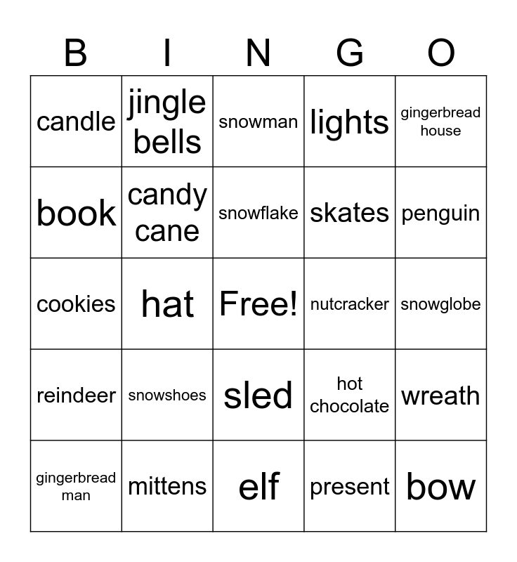 This bingo card has a free space and 24 words: snowshoes, mittens, snowflake, gingerbread man, gingerbread house, candle, book, jingle bells, nutcracker, sled, skates, cookies, hot chocolate, wreath, candy cane, present, snowglobe, snowman, penguin, hat, bow, reindeer, lights and elf.