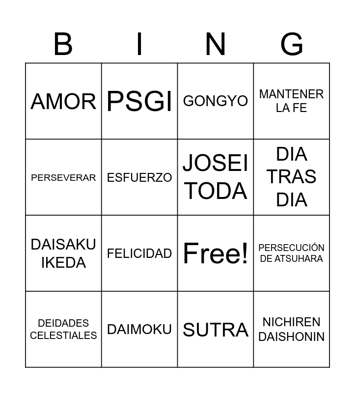 This bingo card has 19 words: Free!, APRENDAMOS UN DRAMA DE VUCTORIA, GONGYO, NICHIREN DAISHONIN, PERSECUCIÓN DE ATSUHARA, PERSEVERAR, SUTRA, AMOR, PSGI, DAISAKU IKEDA, FELICIDAD, ESFUERZO, JOSEI TODA, DAIMOKU, DEIDADES CELESTIALES, DETERMINACION, MANTENER LA FE, DIA TRAS DIA and MES TRAS MES.