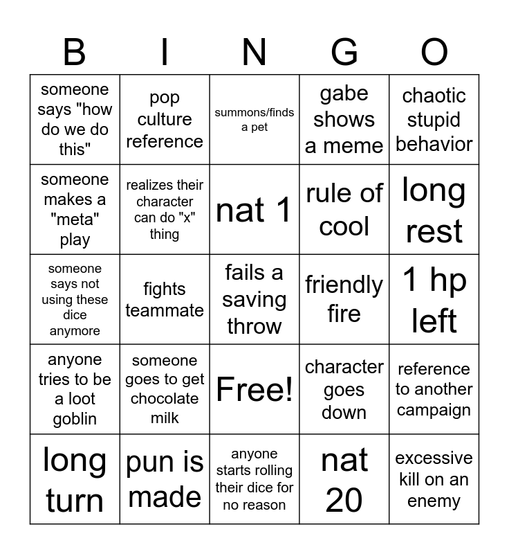This bingo card has 26 words: Free!, nat 20, nat 1, pun is made, chaotic stupid behavior, someone says "how do we do this", someone makes a "meta" play, pop culture reference, 1 hp left, character goes down, rule of cool, someone says not using these dice anymore, reference to another campaign, long turn, fights teammate, creative solution, gabe shows a meme, anyone tries to be a loot goblin, summons/finds a pet, fails a saving throw, long rest, anyone starts rolling their dice for no reason, friendly fire, someone goes to get chocolate milk, realizes their character can do "x" thing and excessive kill on an enemy.