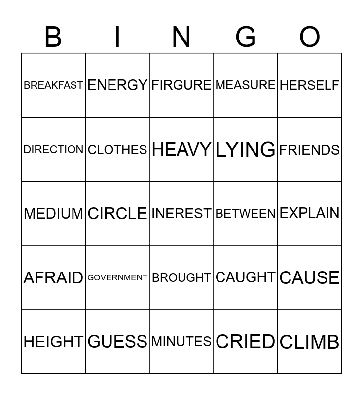 This bingo card has a free space and 24 words: GOVERNMENT, GUESS, HEAVY, HEIGHT, HERSELF, BREAKFAST, DIRECTION, ENERGY, BETWEEN, BROUGHT, LYING, MEDIUM, CAUGHT, CAUSE, CLOTHES, CRIED, EXPLAIN, FIRGURE, FRIENDS, CIRCLE, CLIMB, AFRAID, MEASURE and MINUTES.