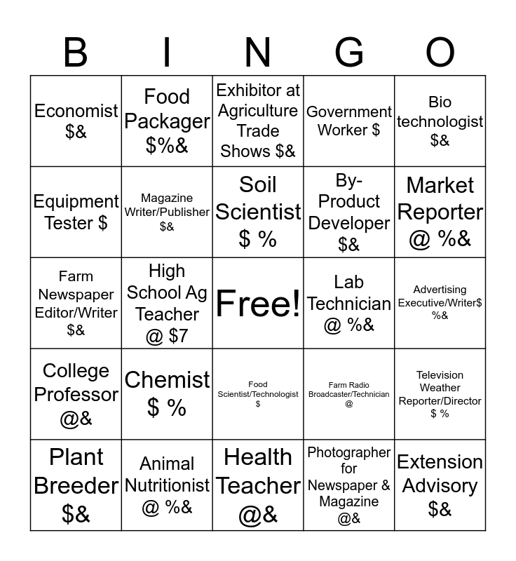 This bingo card has a free space and 24 words: Chemist $ %, Animal Nutritionist @ %&, Soil Scientist $ %, Plant Breeder $&, Bio technologist $&, Economist $&, Equipment Tester $, Food Packager $%&, Lab Technician @ %&, Food Scientist/Technologist $, By-Product Developer $&, Farm Newspaper Editor/Writer $&, Farm Radio Broadcaster/Technician @, Television Weather Reporter/Director $ %, Magazine Writer/Publisher $&, Photographer for Newspaper & Magazine @&, Advertising Executive/Writer$ %&, Exhibitor at Agriculture Trade Shows $&, Market Reporter @ %&, High School Ag Teacher @ $7, Extension Advisory $&, College Professor @&, Government Worker $ and Health Teacher @&.