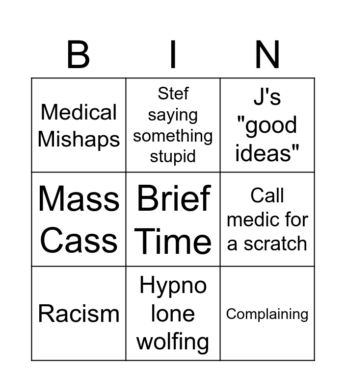This bingo card has a free space and 8 words: Mass Cass, Stef saying something stupid, Call medic for a scratch, Racism, J's "good ideas", Medical Mishaps, Hypno lone wolfing and Complaining.