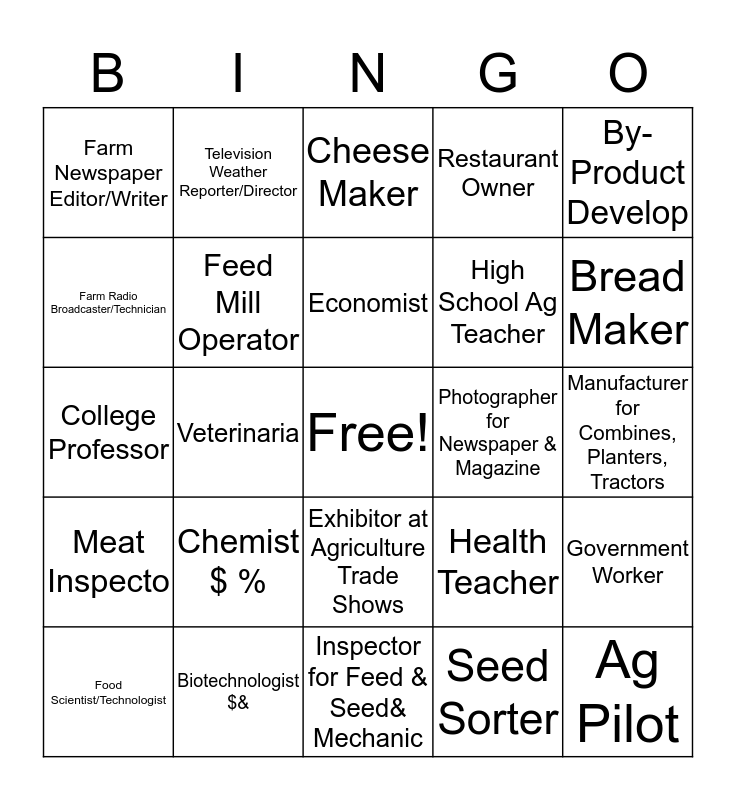 This bingo card has a free space and 24 words: Chemist $ %, Biotechnologist $&, Economist, Food Scientist/Technologist, By-Product Develop, Farm Newspaper Editor/Writer, Farm Radio Broadcaster/Technician, Television Weather Reporter/Director, Photographer for Newspaper & Magazine, Exhibitor at Agriculture Trade Shows, High School Ag Teacher, College Professor, Health Teacher, Government Worker, Feed Mill Operator, Seed Sorter, Manufacturer for Combines, Planters, Tractors, Cheese Maker, Bread Maker, Veterinaria, Ag Pilot, Meat Inspecto, Restaurant Owner and Inspector for Feed & Seed& Mechanic.