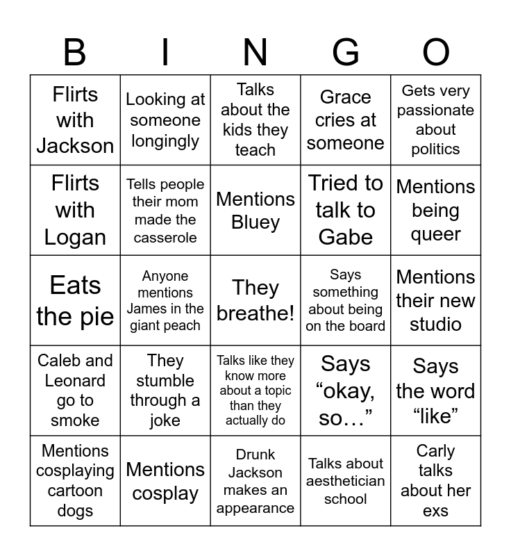 This bingo card has a free space and 24 words: They stumble through a joke, Mentions cosplay, Mentions Bluey, Mentions cosplaying cartoon dogs, Gets very passionate about politics, Flirts with Jackson, Flirts with Logan, Looking at someone longingly, Says something about being on the board, Talks like they know more about a topic than they actually do, Tried to talk to Gabe, Eats the pie, Says “okay, so…”, Says the word “like”, Tells people their mom made the casserole, Talks about aesthetician school, Mentions their new studio, Talks about the kids they teach, Mentions being queer, Anyone mentions James in the giant peach, Carly talks about her exs, Caleb and Leonard go to smoke, Grace cries at someone and Drunk Jackson makes an appearance.