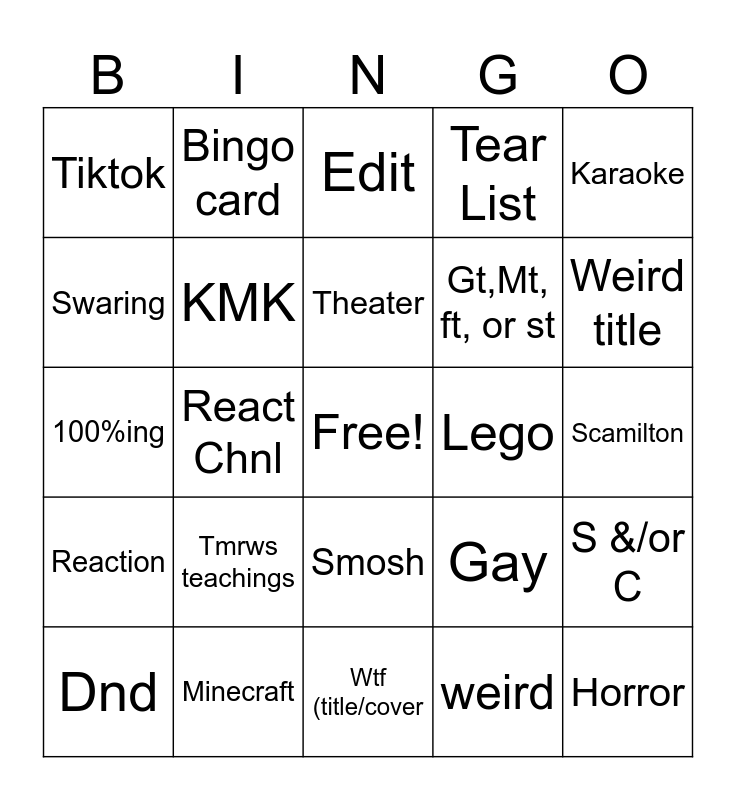 This bingo card has a free space and 24 words: Tmrws teachings, Minecraft, Theater, Dnd, Karaoke, Tiktok, Swaring, Bingo card, Lego, Smosh, Gt,Mt, ft, or st, 100%ing, Gay, S &/or C, KMK, weird, Scamilton, Edit, Weird title, React Chnl, Horror, Reaction, Tear List and Wtf (title/cover.