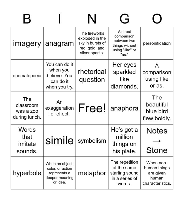 This bingo card has a free space and 25 words: simile, metaphor, rhetorical question, hyperbole, personification, imagery, onomatopoeia, anagram, anaphora, symbolism, Her eyes sparkled like diamonds., The classroom was a zoo during lunch., He’s got a million things on his plate., Notes → Stone, You can do it when you believe. You can do it when you try., The leaves danced in the autumn breeze., The beautiful blue bird flew boldly., The fireworks exploded in the sky in bursts of red, gold, and silver sparks., A comparison using like or as., An exaggeration for effect., When non- human things are given human characteristics., When an object, color, or action represents a deeper meaning or idea., Words that imitate sounds., A direct comparison between two things without using "like" or "as." and The repetition of the same starting sound in a series of words..