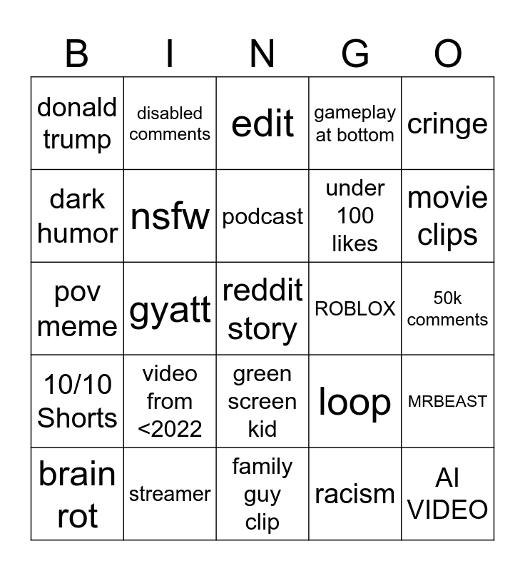 This bingo card has a free space and 24 words: video from <2022, streamer, podcast, brain rot, cringe, donald trump, dark humor, disabled comments, ROBLOX, green screen kid, under 100 likes, pov meme, loop, MRBEAST, nsfw, racism, 50k comments, edit, movie clips, gyatt, AI VIDEO, 10/10 Shorts, gameplay at bottom and family guy clip.