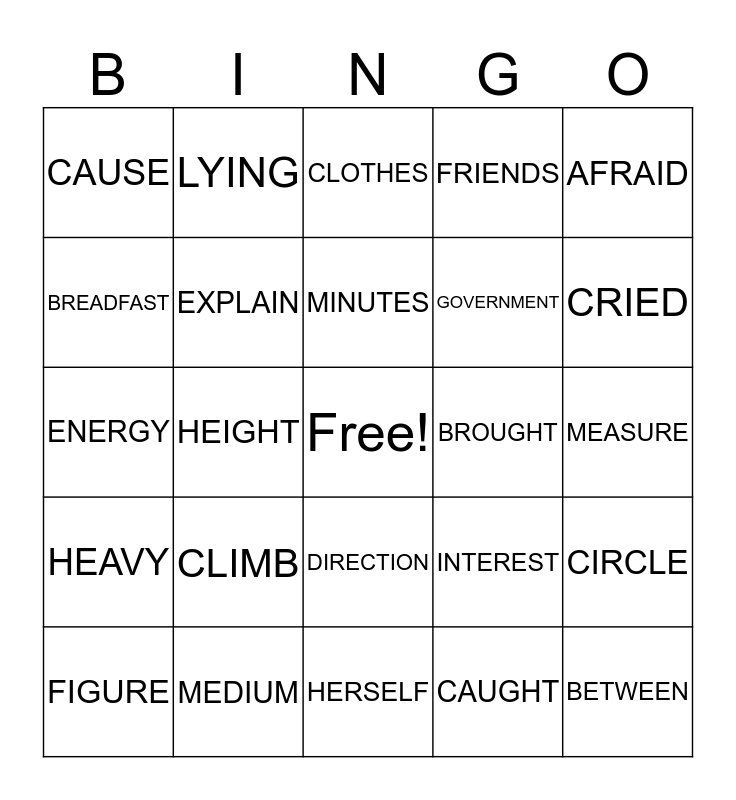 This bingo card has a free space and 24 words: CLIMB, MEDIUM, MINUTES, FIGURE, AFRAID, CAUSE, BREADFAST, LYING, BROUGHT, DIRECTION, GOVERNMENT, ENERGY, INTEREST, CIRCLE, EXPLAIN, CAUGHT, MEASURE, CLOTHES, CRIED, HEIGHT, BETWEEN, HEAVY, FRIENDS and HERSELF.