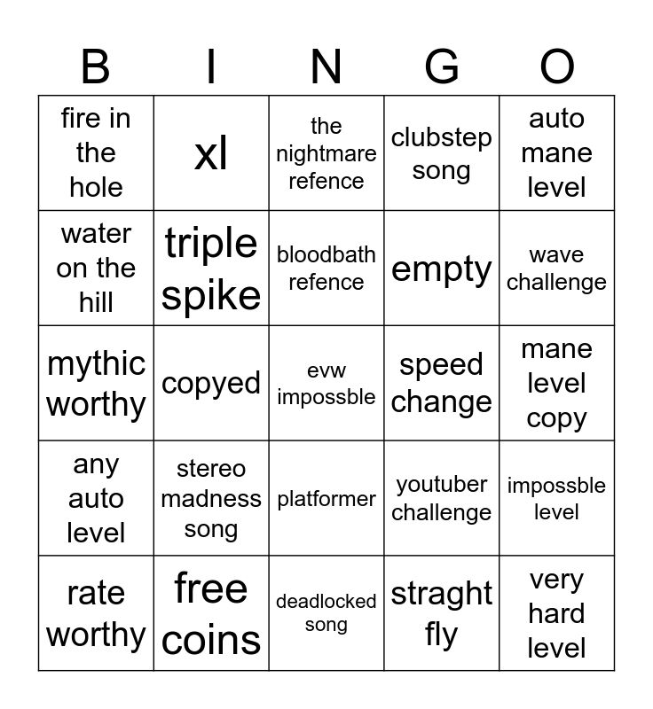 This bingo card has a free space and 24 words: stereo madness song, free coins, bloodbath refence, rate worthy, auto mane level, fire in the hole, water on the hill, xl, speed change, platformer, empty, mythic worthy, youtuber challenge, impossble level, triple spike, straght fly, mane level copy, the nightmare refence, wave challenge, copyed, very hard level, any auto level, clubstep song and deadlocked song.