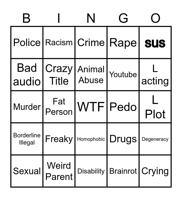 This bingo card has a free space and 24 words: Freaky, Weird Parent, Animal Abuse, Sexual, sus, Police, Bad audio, Racism, Pedo, Homophobic, Youtube, Murder, Drugs, Degeneracy, Crazy Title, Brainrot, L Plot, Crime, L acting, Fat Person, Crying, Borderline Illegal, Rape and Disability.