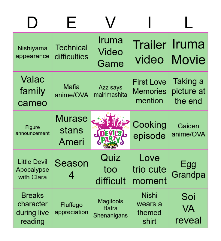 This bingo card has a free space and 24 words: Season 4, Fluffego appreciation, Azz says mairimashita, Breaks character during live reading, Iruma Movie, Nishiyama appearance, Valac family cameo, Technical difficulties, Cooking episode, Quiz too difficult, First Love Memories mention, Figure announcement, Love trio cute moment, Egg Grandpa, Mafia anime/OVA, Nishi wears a themed shirt, Gaiden anime/OVA, Iruma Video Game, Taking a picture at the end, Murase stans Ameri, Soi VA reveal, Little Devil Apocalypse with Clara, Trailer video and Magitools Batra Shenanigans.