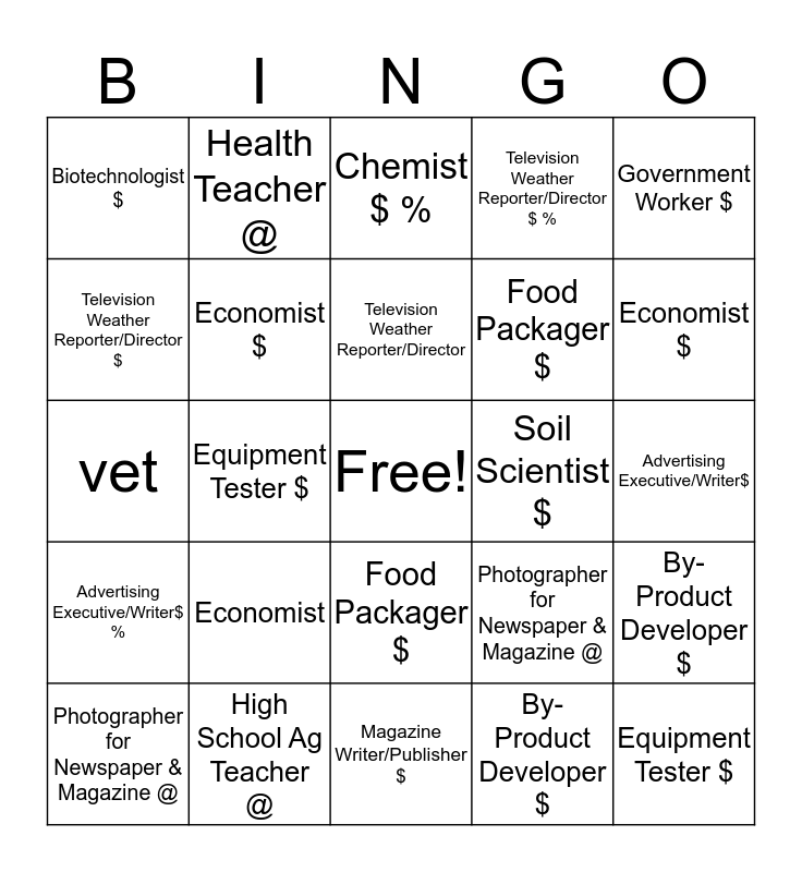 This bingo card has a free space and 24 words: Economist, High School Ag Teacher @, Television Weather Reporter/Director, Photographer for Newspaper & Magazine @, Government Worker $, Biotechnologist $, Television Weather Reporter/Director $, Health Teacher @, Soil Scientist $, Food Packager $, Food Packager $, vet, Photographer for Newspaper & Magazine @, By-Product Developer $, Economist $, By-Product Developer $, Advertising Executive/Writer$, Chemist $ %, Economist $, Equipment Tester $, Equipment Tester $, Advertising Executive/Writer$ %, Television Weather Reporter/Director $ % and Magazine Writer/Publisher $.