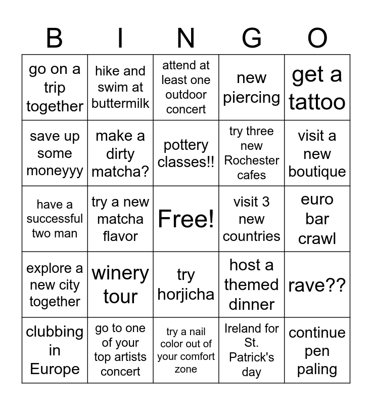 This bingo card has a free space and 24 words: winery tour, go to one of your top artists concert, pottery classes!!, clubbing in Europe, get a tattoo, go on a trip together, save up some moneyyy, hike and swim at buttermilk, visit 3 new countries, try horjicha, try three new Rochester cafes, have a successful two man, host a themed dinner, rave??, make a dirty matcha?, Ireland for St. Patrick's day, euro bar crawl, attend at least one outdoor concert, visit a new boutique, try a new matcha flavor, continue pen paling, explore a new city together, new piercing and try a nail color out of your comfort zone.