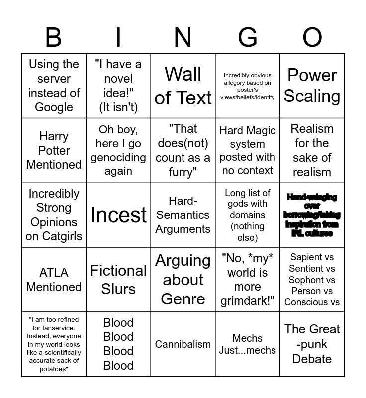 This bingo card has a free space and 24 words: Fictional Slurs, Blood Blood Blood Blood, "That does(not) count as a furry", "I am too refined for fanservice. Instead, everyone in my world looks like a scientifically accurate sack of potatoes", Power Scaling, Using the server instead of Google, Harry Potter Mentioned, "I have a novel idea!" (It isn't), Long list of gods with domains (nothing else), Arguing about Genre, Hard Magic system posted with no context, Incredibly Strong Opinions on Catgirls, "No, *my* world is more grimdark!", Sapient vs Sentient vs Sophont vs Person vs Conscious vs, Oh boy, here I go genociding again, Mechs Just...mechs, Hand-wringing over borrowing/taking inspiration from IRL cultures, Wall of Text, Realism for the sake of realism, Incest, The Great -punk Debate, ATLA Mentioned, Incredibly obvious allegory based on poster's views/beliefs/identity and Cannibalism.
