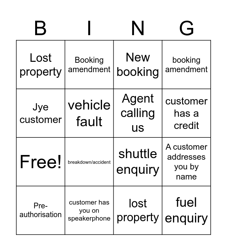 This bingo card has 20 words: A customer addresses you by name, Referred to agent, New booking, angry customer, Pre-authorisation, Jye customer, customer has you on speakerphone, Lost property, Free!, Booking amendment, breakdown/accident, shuttle enquiry, vehicle fault, fuel enquiry, Agent calling us, Jye customer, customer has a credit, booking amendment, lost property and pre-authorisation.