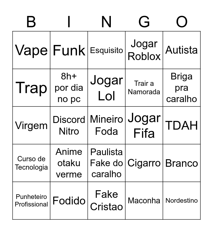 This bingo card has a free space and 27 words: Cigarro, Beber, Trair a Namorada, Fake Cristao, Trap, Esquisito, Funk, Curso de Tecnologia, Jogar Fifa, Branco, Virgem, Jogar Roblox, Punheteiro Profissional, Fodido, Briga pra caralho, Negro, 8h+ por dia no pc, Jogar Lol, Anime otaku verme, Vape, TDAH, Maconha, Discord Nitro, Nordestino, Paulista Fake do caralho, Autista and Estadunidense de merda.