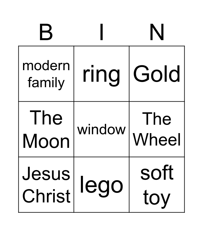 This bingo card has a free space and 24 words: rice, dog, lego, shrek, soft toy, modern family, The Wheel, ring, Christmas, Horse, Pikachu, Chicken Broccoli Alfredo Pasta, Atlantis, Minecraft, Jesus Christ, The Transistor, Gum, Gold, The Number "7", John F. Kennedy, Bear (any kind works), Lava Lamp, The Moon and Depression.