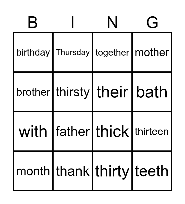 This bingo card has 16 words: thank, thirteen, together, birthday, with, Thursday, thick, thirty, brother, thirsty, month, mother, father, bath, their and teeth.