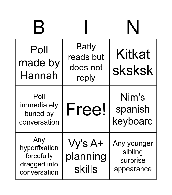 This bingo card has a free space and 8 words: Nim's spanish keyboard, Kitkat sksksk, Batty reads but does not reply, Any hyperfixation forcefully dragged into conversation, Poll made by Hannah, Any younger sibling surprise appearance, Poll immediately buried by conversation and Vy's A+ planning skills.