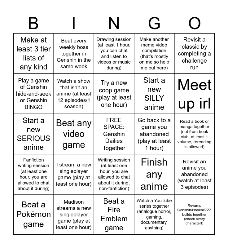This bingo card has a free space and 24 words: I stream a new singleplayer game (play at least one hour), Madison streams a new singleplayer game (play at least one hour), Try a new coop game (play at least one hour), Beat a Pokémon game, Revisit a classic by completing a challenge run, Make at least 3 tier lists of any kind, Play a game of Genshin hide-and-seek or Genshin BINGO, Beat every weekly boss together in Genshin in the same week, Go back to a game you abandoned (play at least 1 hour), Writing session (at least one hour, you are allowed to chat about it during, non-fanfiction), Start a new SILLY anime, Start a new SERIOUS anime, Finish any anime, Revisit an anime you abandoned (watch at least 3 episodes), Watch a show that isn't an anime (at least 12 episodes/1 season), Watch a YouTube series together (analogue horror, gaming, documentary, anything), Read a book or manga together (not from book club, at least 1 volume, rereading is allowed), Drawing session (at least 1 hour, you can chat and listen to videos or music during), Meet up irl, Beat any video game, Revamp Genshin/Honkai/ZZZ builds together (check every character!), Fanfiction writing session (at least one hour, you are allowed to chat about it during), Make another meme video compilation (that’s mostly on me so help me out here) and Beat a Fire Emblem game.