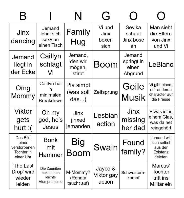 This bingo card has 36 words: Swain, Big Boom, Jayce & Viktor gay action, Jemand liegt in der Ecke, Viktor gets hurt :(, Zeitsprung, Caitlyn schlägt Vi, M-Mommy? (Renata taucht auf), Sevika schaut Jinx böse an, Found family?, LeBlanc, Vi und Jinx boxen sich, Jemand will sich selbst aus der Existenz deleten, Caitlyn hat n minimalen Breakdown, Boom, Jinx dancing, Das Bild einer verstorbenen Tochter in einer Uhr, Geile Musik, Omg Mommy, Family Hug, Pia simpt (was soll das...), Oh my god, he's Jesus, Lesbian action, Jinx jinxed jemanden, Jinx missing her dad, Jemand lehnt sich sexy an einen Tisch, Jemand springt in einen Abgrund, Die Zauniten bekommen leichte Atemprobleme, Jemand, den wir mögen, stirbt, Man sieht die Eltern von Jinx und Vi, Marcus' Tochter tritt ins Militär ein, 'The Last Drop' wird wieder leiden, Etwas ist in einem Glas, was da net reingehört, Vi gibt einem der anderen character auf die Fresse, Bonk mit Hammer and Schwestern- kampf.