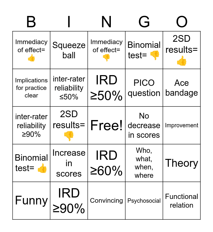 This bingo card has a free space and 41 words: ergonomic intervention, inter-rater reliability ≥90%, inter-rater reliability ≥80%, inter-rater reliability ≤50%, IRD ≥90%, IRD ≥60%, IRD ≥50%, Tau, 2SD results= 👍, Binomial test= 👍, 2SD results= 👎, Binomial test= 👎, Functional relation, Improvement, No decrease in scores, Increase in scores, Visual analysis= 👍, Immediacy of effect= 👍, Visual analysis= 👎, Immediacy of effect= 👎, Theory, Superb background, Convincing, PICO question, Pencil grip, Paper texture, Psychosocial, Lined paper, Ace bandage, Intentional practice sessions, Hand strengthening, Squeeze ball, Funny, Promotes OT, Who, what, when, where, Implications for practice clear, Take home message clear, Very nice graph, I learned something new, Inspiring and Good music.