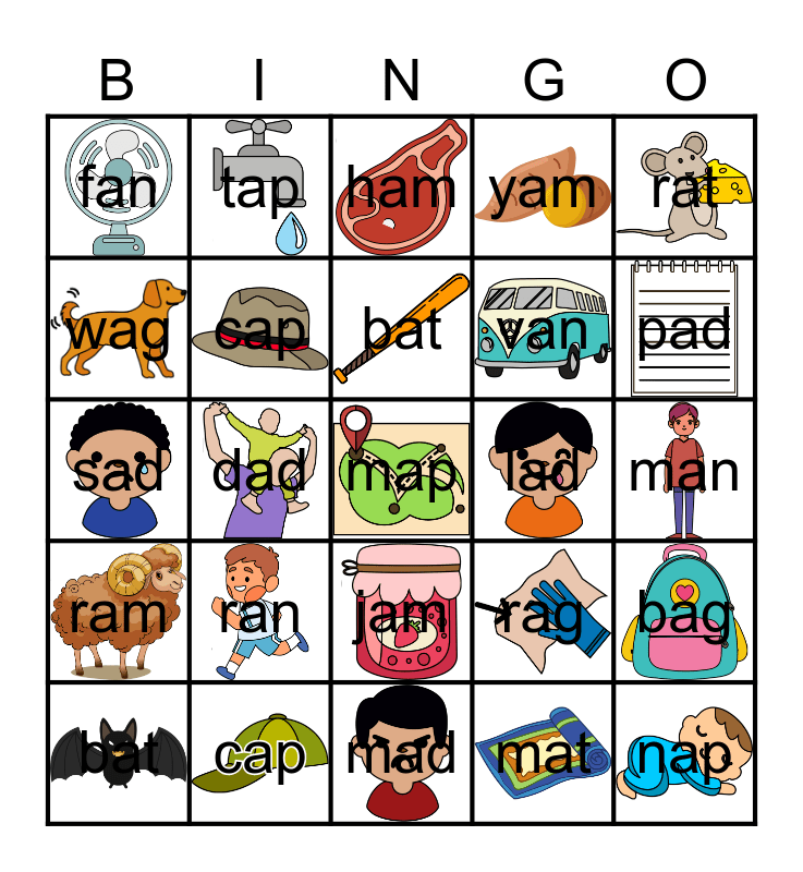 This bingo card has 30 images and 30 words: cap, cat, dad, fan, fan, ham, cap, jam, lad, mad, man, map, mat, nap, pad, pan, rag, ram, ran, rat, sad, tag, tap, van, wag, yam, bag, bat, bat and can.