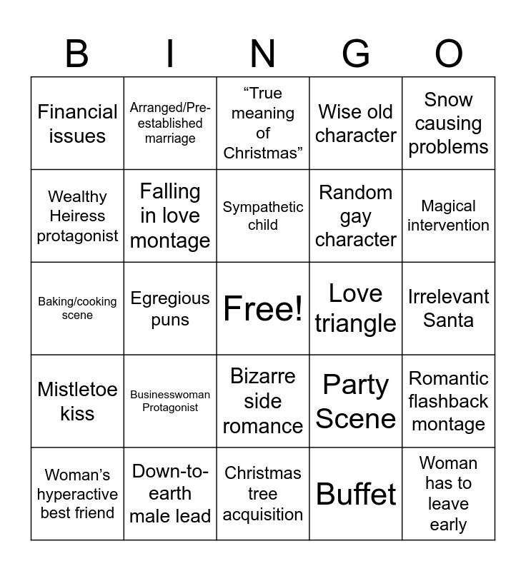 This bingo card has a free space and 24 words: Businesswoman Protagonist, Down-to-earth male lead, Sympathetic child, Woman’s hyperactive best friend, Snow causing problems, Financial issues, Wealthy Heiress protagonist, Arranged/Pre-established marriage, Love triangle, Bizarre side romance, Random gay character, Baking/cooking scene, Party Scene, Romantic flashback montage, Falling in love montage, Buffet, Irrelevant Santa, “True meaning of Christmas”, Magical intervention, Egregious puns, Woman has to leave early, Mistletoe kiss, Wise old character and Christmas tree acquisition.