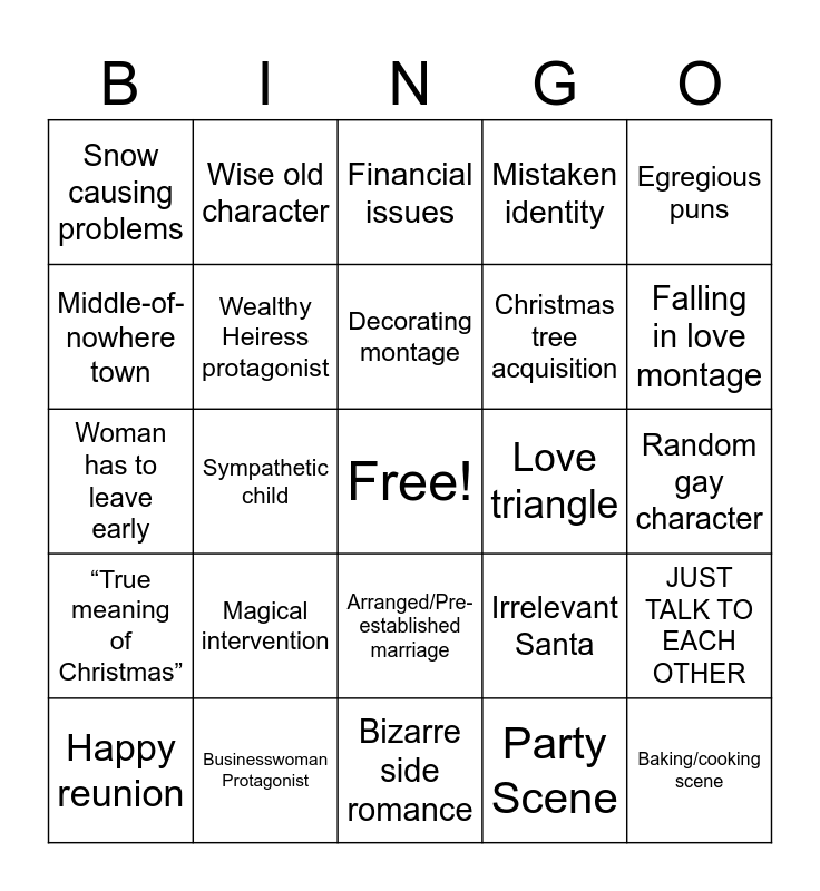 This bingo card has a free space and 30 words: Businesswoman Protagonist, Down-to-earth male lead, Sympathetic child, Woman’s hyperactive best friend, Snow causing problems, Financial issues, Wealthy Heiress protagonist, Arranged/Pre-established marriage, Love triangle, Bizarre side romance, Random gay character, Baking/cooking scene, Party Scene, Romantic flashback montage, Falling in love montage, Buffet, Irrelevant Santa, “True meaning of Christmas”, Magical intervention, Egregious puns, Woman has to leave early, Mistletoe kiss, Wise old character, Christmas tree acquisition, Middle-of-nowhere town, Mistaken identity, JUST TALK TO EACH OTHER, Happy reunion, Decorating montage and A memory invokes decoration.