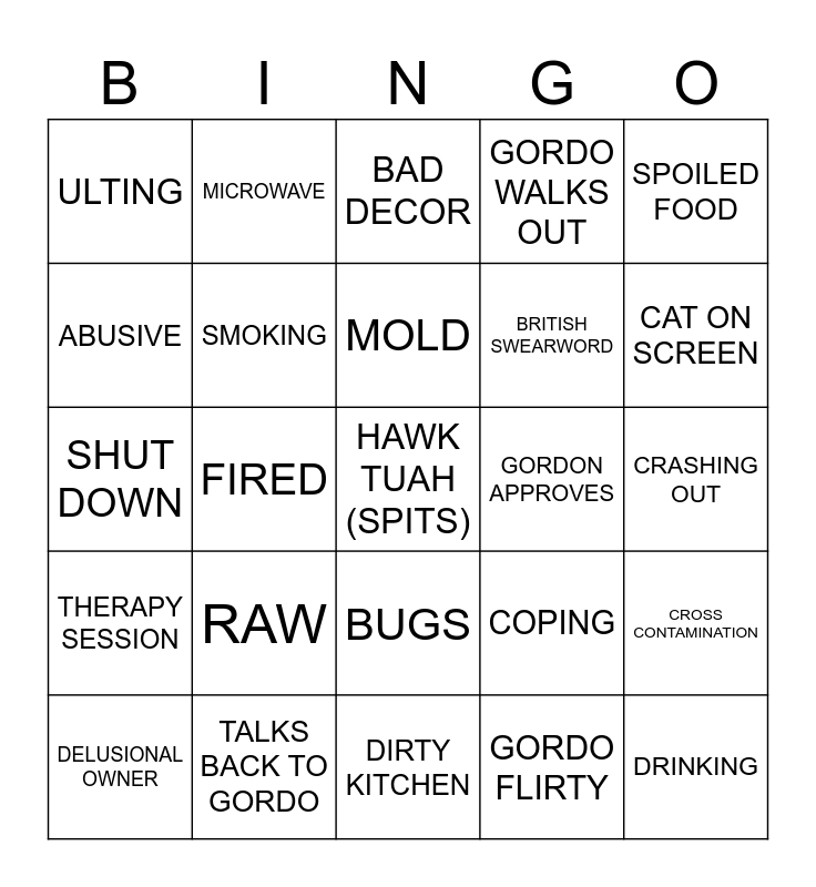 This bingo card has 25 words: RAW, DIRTY KITCHEN, MOLD, DELUSIONAL OWNER, SPOILED FOOD, ULTING, ABUSIVE, MICROWAVE, GORDON APPROVES, BUGS, BRITISH SWEARWORD, SHUT DOWN, COPING, CROSS CONTAMINATION, SMOKING, DRINKING, CRASHING OUT, BAD DECOR, CAT ON SCREEN, FIRED, HAWK TUAH (SPITS), TALKS BACK TO GORDO, THERAPY SESSION, GORDO WALKS OUT and GORDO FLIRTY.